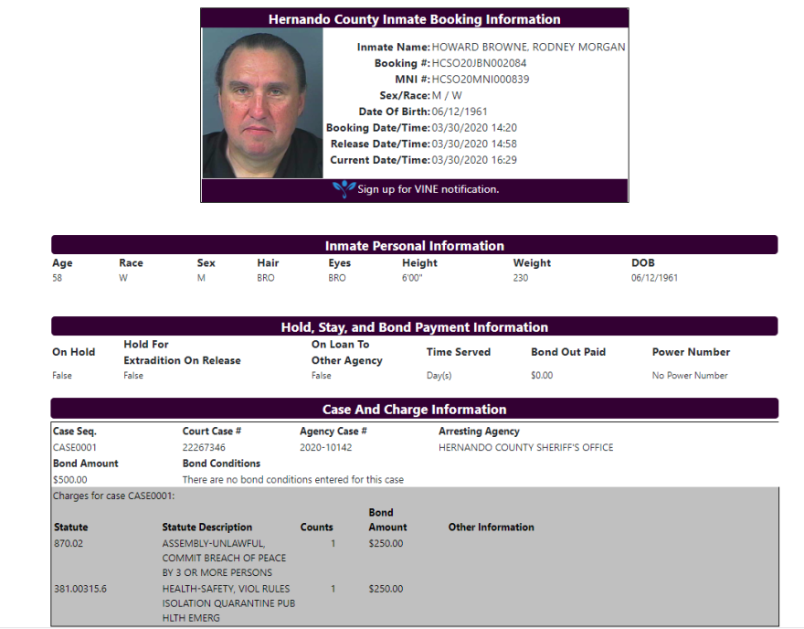 Howard-Browne was arrested on a warrant for unlawful assembly and violation of public health emergency rules, both of which are second degree misdemeanors. Hillsborough authorities confirmed his arrest via email, saying he was taken into custody at his home in Hernando County around 1:30 p.m. Monday.