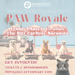 Join Humane Society of Sarasota County for PAW Royale on March 13 at the Ritz-Carlton, Sarasota. Inspired by the vibrance of Old Florida, this luncheon brings together community leaders, local businesses, and animal lovers to support lifesaving care for homeless pets.