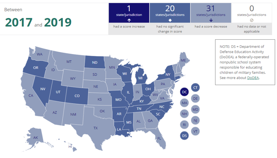 Reading remains the big problem nationally, with both fourth- and eighth-graders testing lower. Thirty-one states had eighth-graders take a drop in reading scores from 2017.