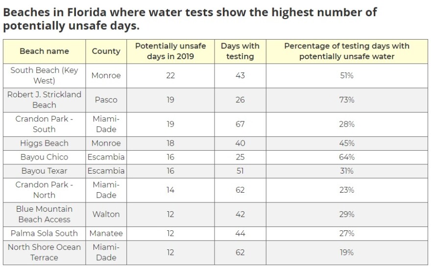 Environment Florida Research and Policy Center compiled data from the state and found that last year, 187 of 261 beaches tested had enough pollution to put swimmers at risk of getting sick on at least one day during the year.