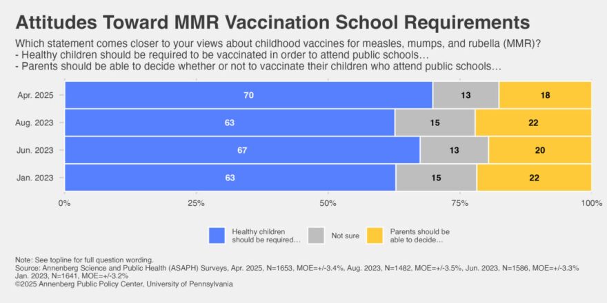 According to the survey by Annenberg Public Policy Center, 70% of adults favor mandates for MMR vaccines in schools — an increase from 63% in 2023. The survey of 1,653 adults was conducted in April as the United States was facing measles outbreaks.