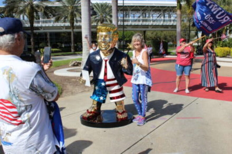 At a street corner, people took selfies with a golden statue of Trump wearing swim trunks.