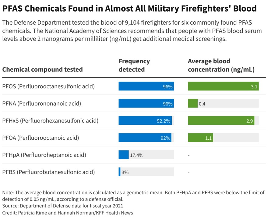 And multiple studies show that firefighters, both military and civilian, have been diagnosed with testicular cancer at higher rates than people in most other occupations, often pointing to the presence of perfluoroalkyl and polyfluoroalkyl substances, or PFAS, in the foam.