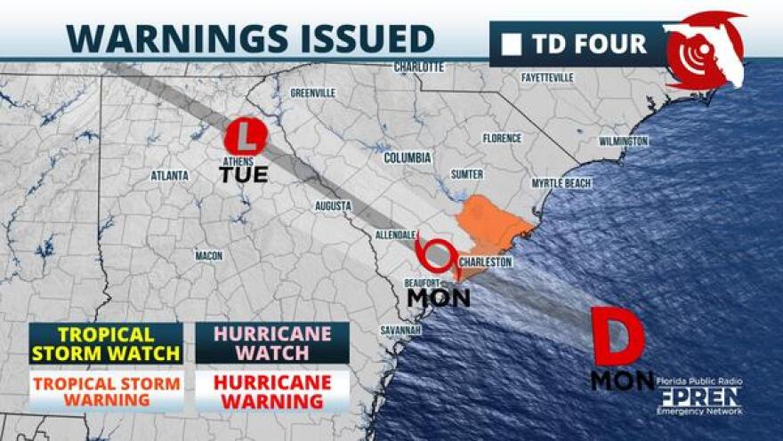 Tropical Storm Warnings have been posted for a portion of the South Carolina coastline in advance of Tropical Depression 4, which formed a little more than 100 miles from Charleston late Monday morning.
