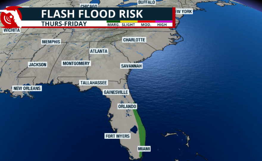There is the chance of flash floods that cover the mostly populated areas across Miami-Dade, Broward, Palm Beach, and the northern Keys on Thursday into Friday morning. Overall, between 1 and 3 inches are possible, with a few spots along the southeast coast that could receive up to 4 inches. Southwest Florida will experience a few showers that will persist, although rainfall will be less concentrated in this region, with amounts of up to 2 inches.
