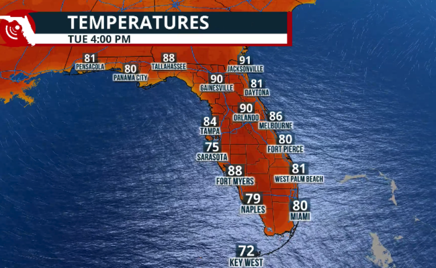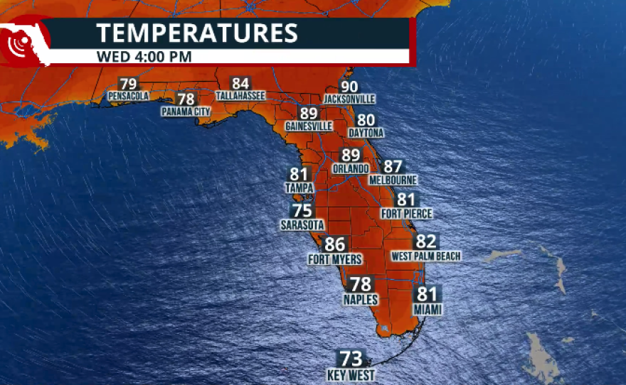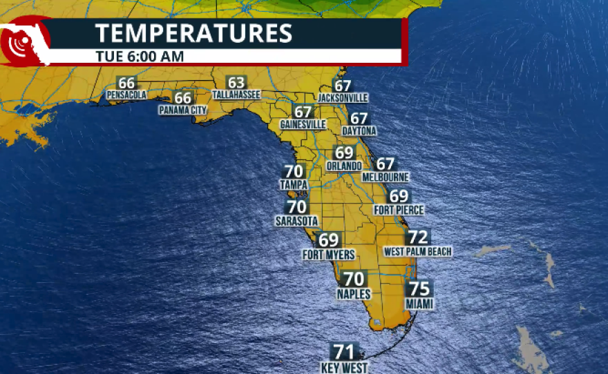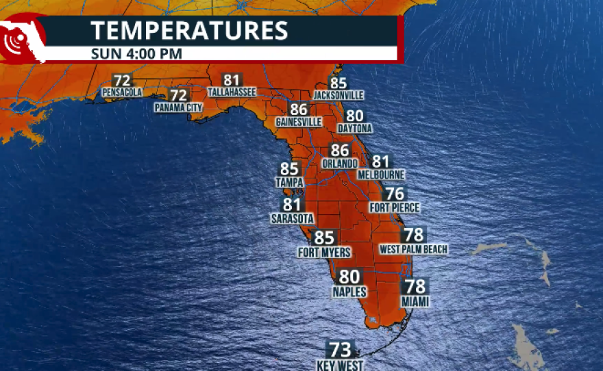 Mornings will remain muggy and warm, with low temperatures staying about 5 to 10 degrees above normal for this time of year. Lows across the Panhandle will be in the low to mid-60s, while Central and South Florida will range between 67 and 71 degrees.
