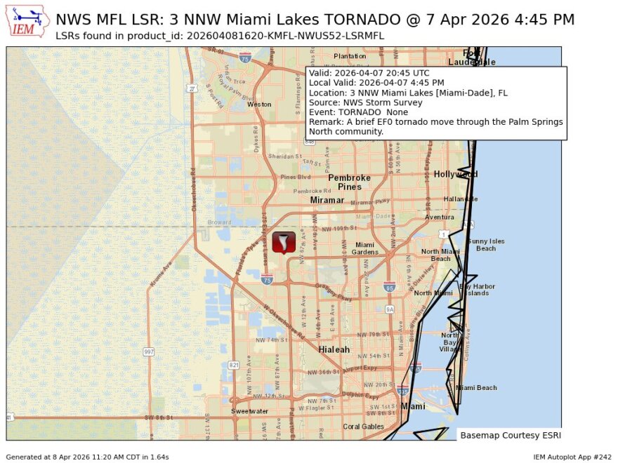 This week continues to produce records and interesting events. In the Palm Springs North neighborhood of Miami-Dade County, a tornado touched down Tuesday afternoon. The National Weather Service evaluated damage left by a thunderstorm that formed along the northern portion of Miami-Dade County, crossing I-75 and the Turnpike. The storm produced a short-lived EF0 tornado in the Palm Springs North community. Estimated peak winds were 85 mph, and it had a track of about half a mile.